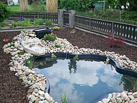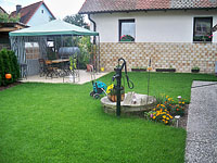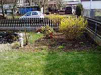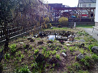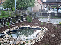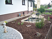 Es wird eine Gartenteichschale gesetzt und mit großen Kieselsteinen umrandet, ein Bachlauf gehört natürlich auch dazu. Mit einem Einzeiler wird die Gartenanlage noch etwas verfeinert. Damit nicht mehr so viel Unkraut wächst wird ein Schutzvlies verlegt und mit Rindenmulch aufgefüllt. Die Rasenfläche wird neu angesät und verschieden Anpflanzungen erfolgen. Das Kiesbeet gibt den letzten Kick und macht viel her.
