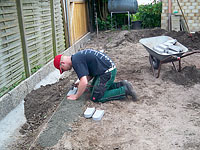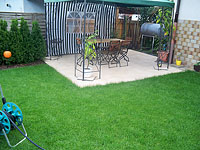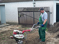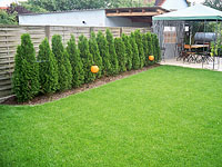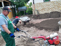 Der alte Boden muss erst aufgelockert und gefräst werden. Ein Einzeiler wird für die Anpflanzung der Thujahecke gesetzt. Der reichhaltige Mutterboden wird verteilt und abgewalzt. Dann kommt der Rollrasen zum Einsatz. Eine kleine Fläche für das Pavillon wird ausgespart, die anschließend gepflastert wird. Unter die Thujahecke kommt ein Schutzvlies und Rindenmulch.