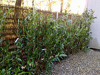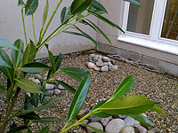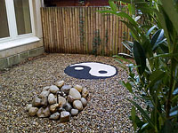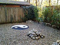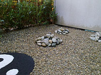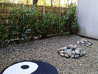 Ying und Yang eine kleine Spielerei mit Kieselsteinen. Passend zum Kirschlorbeer wird ein Sichtschutz gesetzt und ein Kiesbeet angelegt.